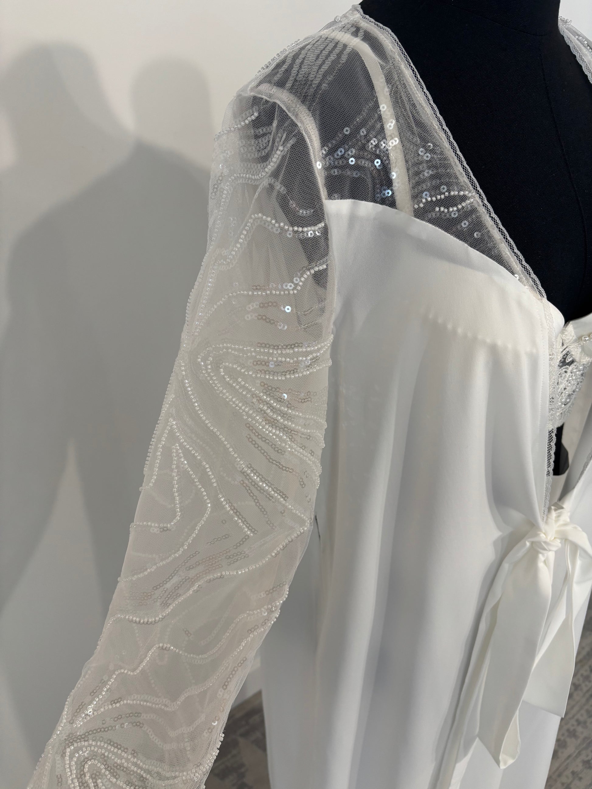Introducing Lydia from Rara Avis. A long semi-sheer robe with long sleeves adorned with sequins and beads along the sleeves and across the chest and back.