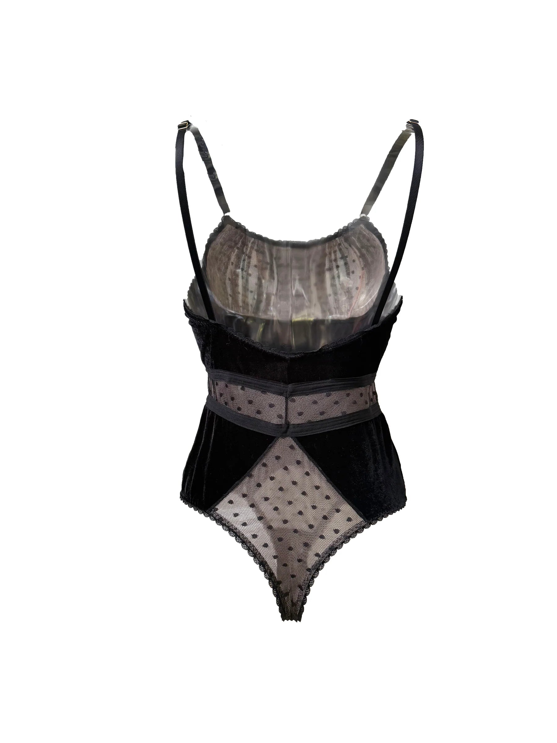 This Origins Velvet Polka Dot Ruched Bust Bodysuit combines luxurious stretch velvet with delicate polka dot tulle for a sophisticated look. Featuring a ruched bust and a flattering neckline, it enhances your silhouette while the waist-cinching polka dot detail adds definition. The thong back ensures a seamless fit, complemented by adjustable straps and gold hardware for personalized comfort. An adjustable inner thigh hook and eye provide secure wear, making this bodysuit both elegant and functional.